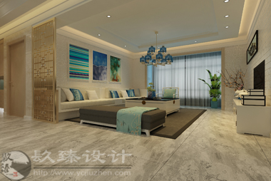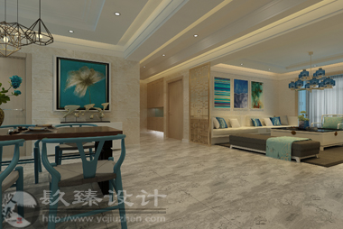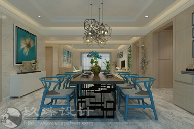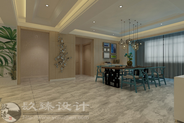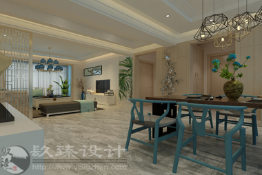 本案中室內整體色調偏向于冷色調,藍青色從視覺上帶給人寒冷的感觸,在小編的認知中,喜歡冷色調的人都是非常冷靜沉著的,事實證明就是這樣,業主本身非常穩重,他注重家庭關系的和諧,他覺得和諧能使人在視覺上,心理上獲得寧靜、平和的滿足。而且現在不是追求和諧社會嗎,和諧社會當然是從和諧家庭開始的。