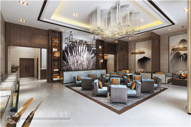 銷售中心的作用,歷來是要展現項目實力,渲染生活方式,多以至奢至大至精的要求打造。本案售樓中心從家具擺放到室內裝飾,無一不在強調精英人群的精致生活。拉絲吊燈,鑲嵌閃鉆如星光閃耀,以優雅的調性提升質感。洽談區天藍色天鵝絨布面包裹著的沙發椅舒適雅致,與售樓部整體相得益彰,周圍墻壁上的水墨山水圖恰如其分的表明了此處樓盤暗含的世外桃源意境,沙盤獨立分隔展示,給客戶以貴賓的服務于享受。室內以干枝枯木造景,配以鳥鳴,好一個山水田園生活!
