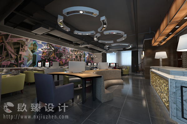 在大廳內(nèi),裝飾簡單,干凈整潔,清靜自然。在色彩上搭配上,采用深色與淺色對比色彩搭配,讓感覺舒適恬靜,適度的裝飾使網(wǎng)咖大廳不缺乏時代氣息,使人在空間得到精神和身體的放松,給人們緊張的生活帶來一絲輕松、休閑。