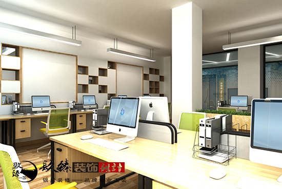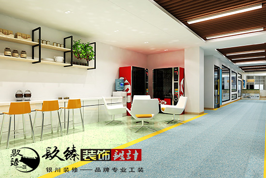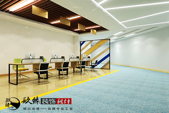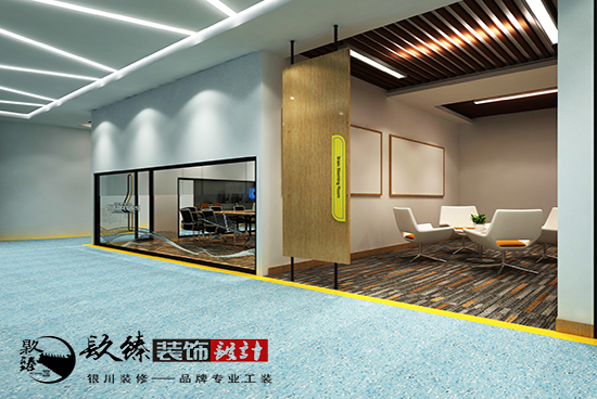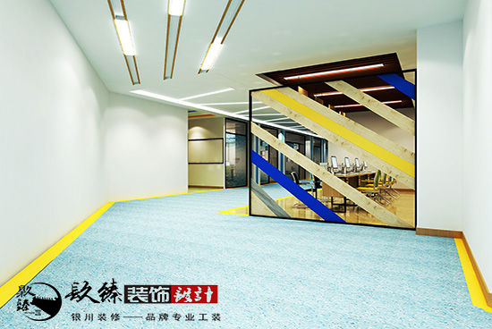 銀川裝飾公司|銀川辦公室裝修設計|設計師楊芮設計的創業孵化園風格非常的多彩,顏色搭配的非常的濃重,使用黃色和藍色,這樣冷暖相互搭配也是起到了相互吸引的效果,辦公室內的環境讓人一看就非常有創新,非常的年輕化。再加以明亮的造型燈帶,幾何的造型,體現出了別致的時尚創新風格,更能拉伸室內的空間。