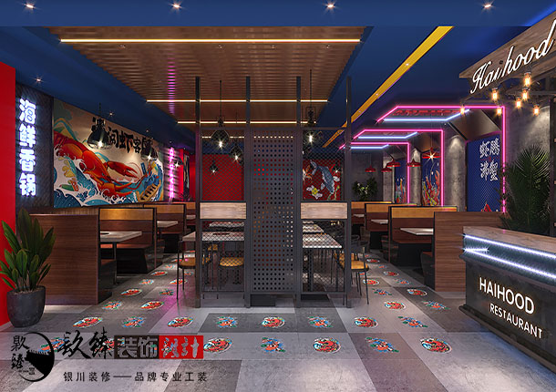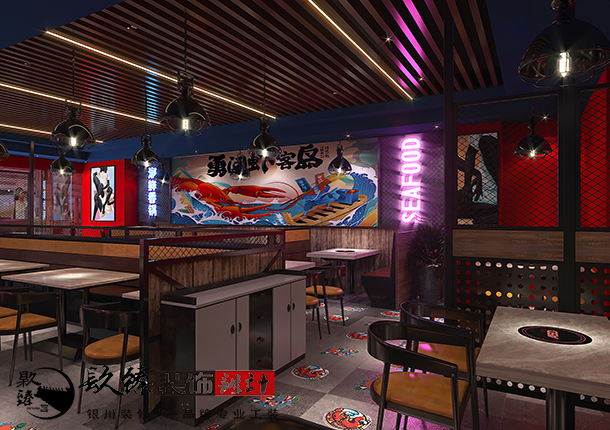 今天小編為大家重磅推薦銀川火鍋店裝修镹臻裝飾最新案例“大武口蝦哥魚妹紙包香鍋,這是一家專注于做“潮魚與美蝦“的特色餐飲,小編看到效果圖之后真的就被驚艷到了,色彩的沖擊使人看了之后內心有一種蠢蠢欲動的感覺,還沒被美食吸引,就首先被裝修吸引進去了。本項目位置在大武口萬達廣場,面積為120平米,銀川裝修|火鍋店裝修設計整體風格為工業風格,現在的工業風格餐廳越來越多,但是真正能把工業風格的美以正確的搭配展示出來的餐廳卻沒有多少,工業風格不只是按部就班的在空間內植入一些金屬水管等材質那么簡單,最終要的是如何將這些風格元素以更專業更自然的設計手法植入當中。而設計上魯玫,就將這一點做的很好,本案例只是稍微的融合了一部分的工業風元素,比如吊頂,軟裝的桌椅配飾、金屬隔墻、工業吊燈等等。