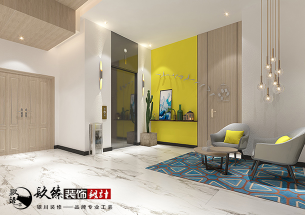 大廳墻面主要以硅藻泥材料,顏色以白色為主,為了使顏色不過于太單調(diào),設(shè)計(jì)師將明亮的黃色融入其中,立刻將整體效果變得非常的活潑,黃色是一個(gè)高可見的顏色,作為銀川裝修公司|銀川賓館酒店裝修設(shè)計(jì)中的點(diǎn)綴效果非常好。該酒店有一種城市中小資的感覺,潔凈,還非常具有線條感,簡(jiǎn)單的前臺(tái)設(shè)計(jì),配幾盞造型吊燈,將簡(jiǎn)單的藝術(shù)氣息升華,休息區(qū)簡(jiǎn)單的布藝沙發(fā)給人一種懶洋洋的錯(cuò)覺。因?yàn)閴γ媸呛?jiǎn)單的白色,所以在地磚的選擇上,設(shè)計(jì)師也是使用以灰白色花紋,大家也許會(huì)想到,這樣大量的使用白色調(diào)來進(jìn)行空間裝飾,會(huì)不會(huì)使整體效果看起來很飄呢?小編這樣告訴您,完全不會(huì),因?yàn)樵O(shè)計(jì)師在踢腳線以及其他可以將線條感加以修飾的材料運(yùn)用的非常的恰當(dāng),讓空間更有整體感,所以不會(huì)有飄的感覺,況且銀川裝修網(wǎng)的銀川镹臻裝飾的設(shè)計(jì)師在配色和造型上都選擇了非常現(xiàn)代前衛(wèi)的,所以更不用有所顧慮啦。