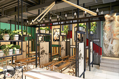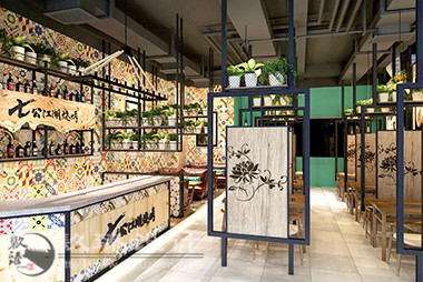 在銀川吃烤串我們可能有很多選擇,但想必大家都聽說過或見過七公江湖的名字。銀川裝飾公司銀川裝飾設計對燒烤店的理解就是熱鬧、人氣。本案的主色調色彩鮮活,其中很多種亮麗的顏色互相搭配和穿插,為顧客們提供一個既有視覺體驗的空間效果、還能有更好的心情來西北燒烤用餐。也因設計師楊熙與高鳳林深知顏色對人體味覺的影響,所以清新的黃色使用率最多、再穿插一系列的后工業元素,在質感的同時能讓人體驗前所未有的空間享受。