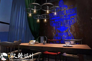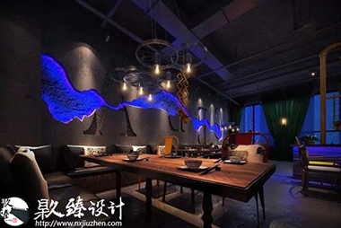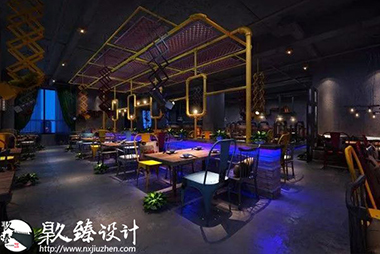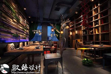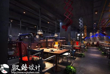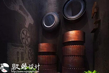 燒烤店其中的一角文化墻上的海苔是這片空間為數不多的綠植,為工業風格的燒烤店帶來一抹綠意,小清新躍入眼簾,很好的緩解了視覺疲勞。清水混凝土墻與鋼的巧妙配合,鐵管與暖色燈光的色彩互動,削減了鋼鐵冷視覺,柔和了空間美。原木的置物架上擺放著主人心愛的藏品,或許是幾個空酒瓶,或許是一卷麻布,又或者是一對仿真羚羊角,全憑主人心情與愛好,也許別人并不覺得有多么珍貴,但是在主人眼里他卻是無價之寶。將工業風格與燒烤店完美的結合起來,鋼鐵空間中也不乏柔情,設計的韻味就體現在此處。