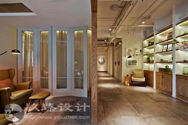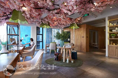 步出電梯就是櫻花樹下的櫥窗,隱約能看見窗內的景象,推門而入是滿眼的櫻花,綠色落地燈猶如撐傘在樹下賞櫻。櫻花樹枝伸到接待室的小屋頂上,透過天窗探出枝頭。