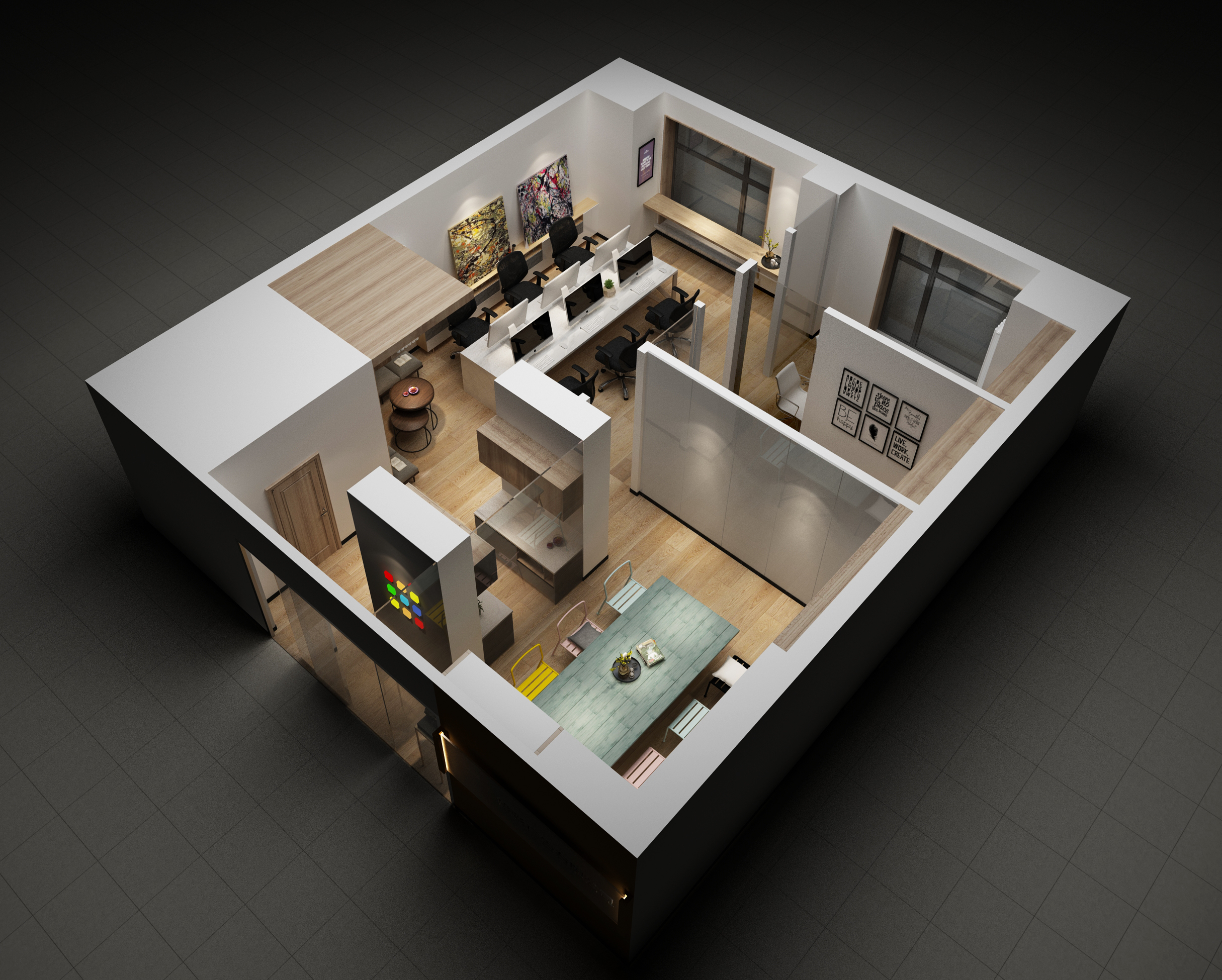 在以上設計案例圖中,可以看到有限的空間里設計了會議室,員工辦公區(qū)域,以及一些特殊的單人辦公室(適合于人事行政部,財務室之類)。甚至還有經(jīng)理辦公室。可謂是辦公室的功能非常齊全,設計師使用黑色與灰色搭配的方式,能夠竟可能的吸收燈光和光線,這使得整個辦公室從觀感上絲毫沒有狹小的感覺,能夠勁量給人舒適的余地,同時在辦公室之間,辦公室和會議室之間使用半墻隔開,這樣的區(qū)分恰到好處的在擴展觀感空間的同時絲毫沒有浪費有限尺寸,可謂是十分完美的考量。而獨特的窗戶,窗臺,畫冊布置,更給予整個幫公司觀感上的充足空間感和舒適感,相信在這里辦公的人心情一定會愉悅。