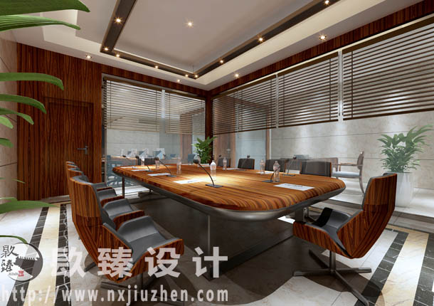 總經理辦公室,簡單的石膏線吊頂,水晶燈,烤漆木桌子,黑色皮椅,辦公桌后還有一個書柜,在這樣一個狹小的空間里,實現了這么多的功能,設計師對于每一個面積的使用都沒有浪費,做到了空間的合理利用。會議室使用烤漆色辦公桌搭配白色的地板顏色,既莊重又不是沉穩。