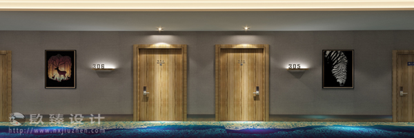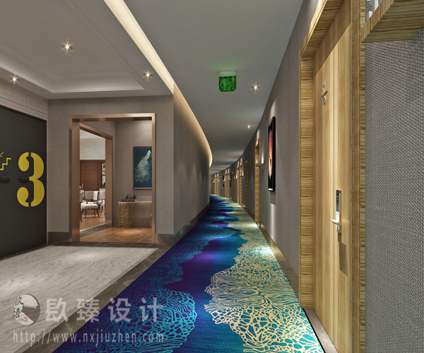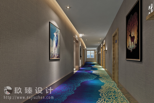 設計師在走廊采用藍色類似波浪的地毯再配以浪漫的裝飾畫,小編不想用多么華麗的辭藻來介紹,一看便知。