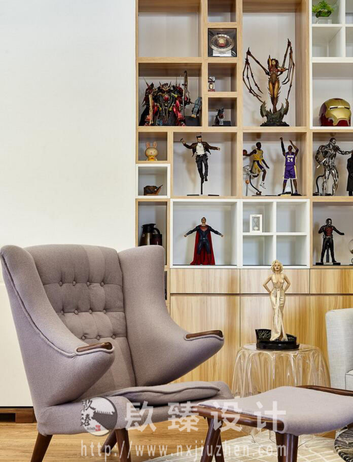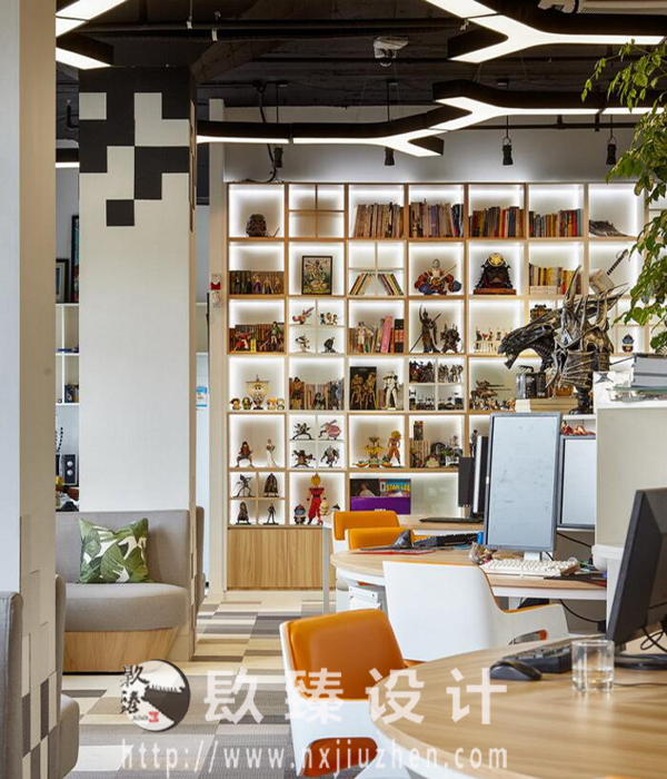 通往主要辦公區(qū)域和接待區(qū)的大面積墻面柜,采用小方格柜逐個(gè)拼接組合,馬賽克以具體直觀的形式,成為空間中最醒目的點(diǎn)綴。大量精美的手辦整齊地放置其中,與格柜組合一起,猶如放大的像素方塊將縮略的影像畫面囊括起來,形成循環(huán)往復(fù)的動(dòng)態(tài)錯(cuò)覺。