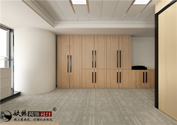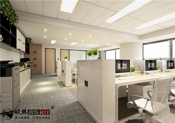 摒棄了一切繁文縟節的矯飾,一切盡在實用、明快而流暢的格局中;配合現代辦公環境的追求,設置實用與展示性相結合的半高書柜,旁倚商務型辦公桌,既陳設精雅、品味清亮、格調一致,又可于繁忙后賞窗外 風光、待客會友;直接在原頂噴涂乳膠漆,凸顯了現代辦公的簡潔,利用不同的燈具劃分了辦公、會客區的燈光。