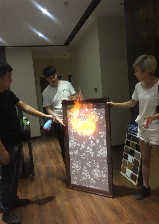 接下來高能!防火耐高溫演示:噴灑酒精后點(diǎn)火,樣品表面燃燒兩分鐘,滅火后無任何變化!